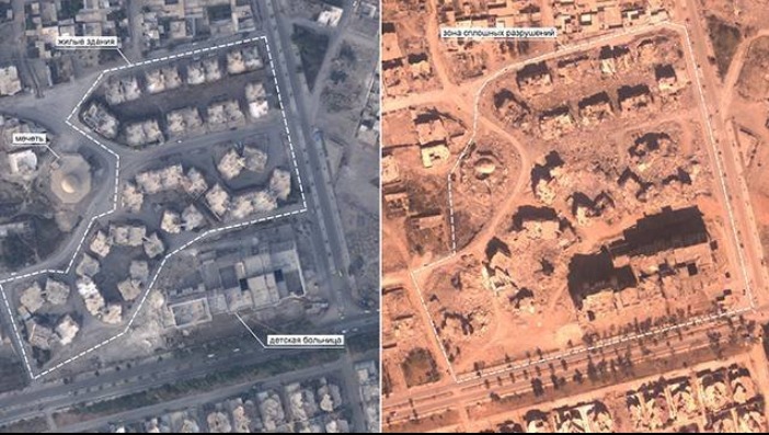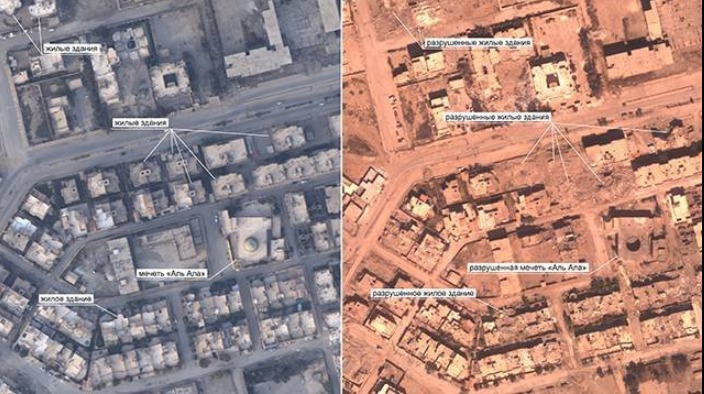 نشرت وزارة الدفاع الروسية، صوراً لمدينة الرقه السورية وتظهر هذه الصور حجم الدمار الناجم عن قصف "التحالف الدولي" للمدينة.