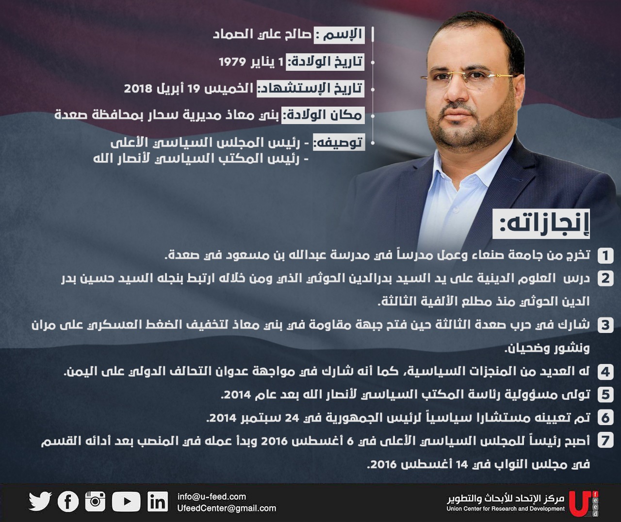 ننعي للشعب اليمني وللأمة جمعاء استشهاد الرجل المؤمن المجاهد العظيم رئيس المجلس السياسي الاعلى الرئيس الشهيد / صالح علي الصماد بعد عمر حافل بالمآثر العظيمة من العمل والعطاء والنضال والجهاد والصبر والصمود في شتى المراحل والظروف والاوضاع وأقساها ..