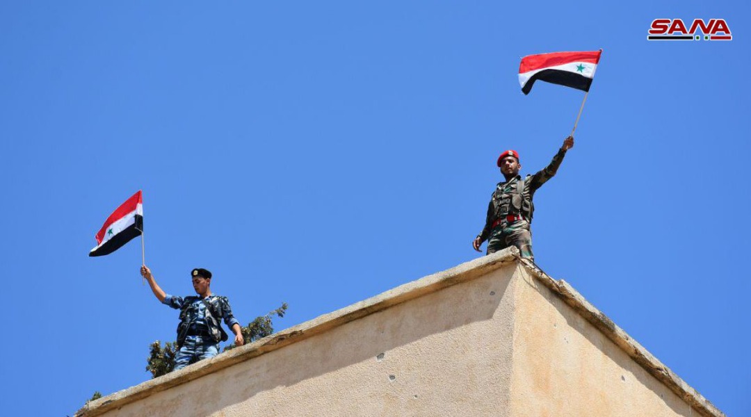 وحدات من الجيش السوري وقوى الأمن الداخلي، ترفع العلم العربي السوري في القرى التي تم إخلاؤها من الإرهابيين في ريف حماة الجنوبي.