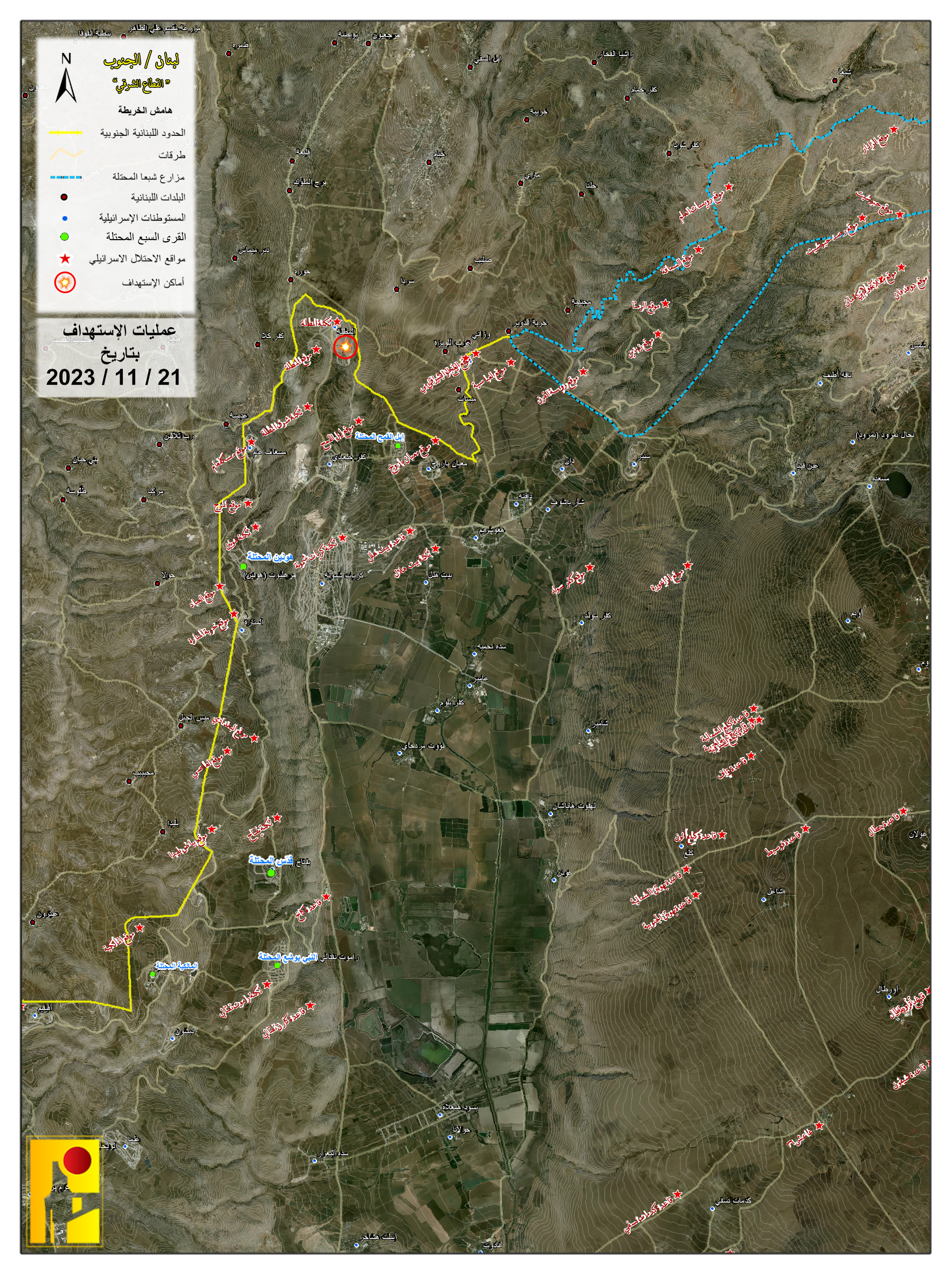 دعماً لشعبنا الفلسطيني الصامد في قطاع غزة وتأييداً لمقاومته الباسلة والشريفة، وردًا على ‏استهداف العدو الصهيوني للمنازل في القرى الجنوبية، استهدف مجاهدو المقاومة الإسلامية عند ‏الساعة 06:40 من صباح يوم الثلاثاء 21-11-2023 منزلًا في مستعمرة المطلة يتمركز فيه جنود ‏للعدو الإسرائيلي بالأسلحة المناسبة وتمّ إصابته إصابة مباشرة. ‏
