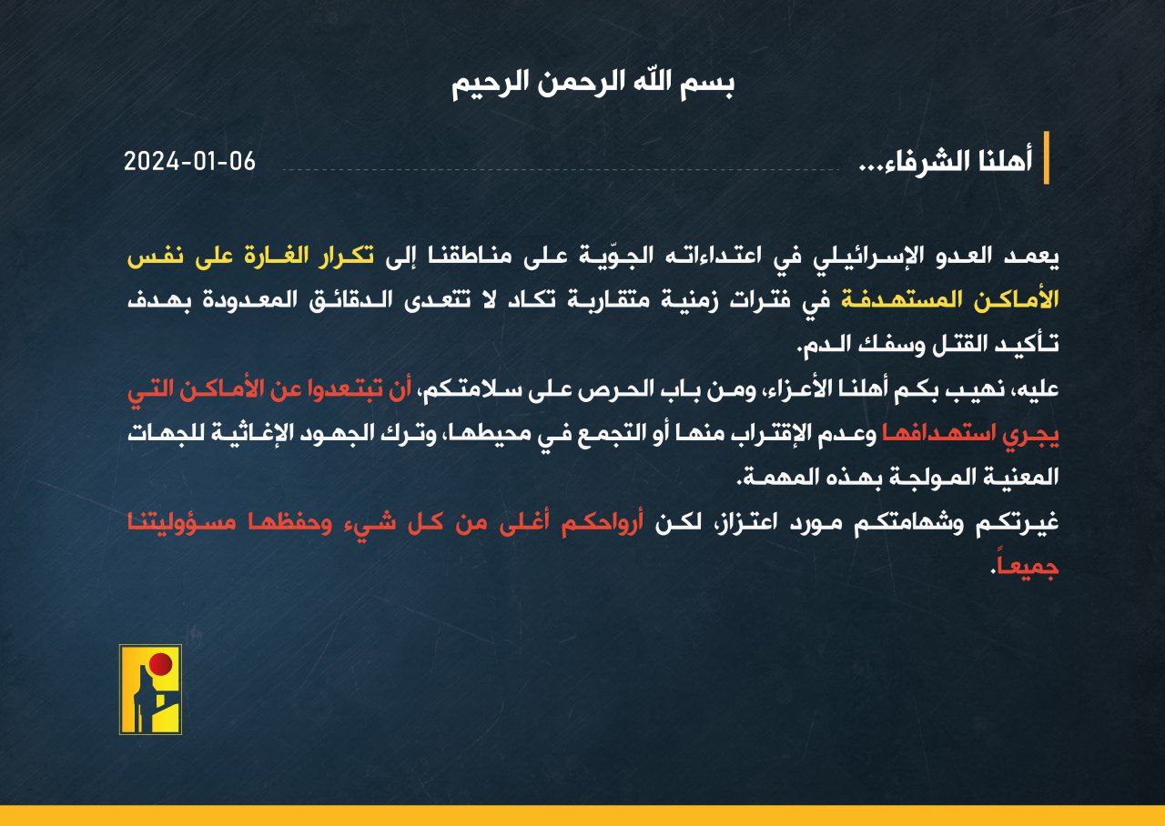 عليه، نهيبُ بِكُم أهلَنا الأعزاء، ومن بابِ الحرص على سلامتكم، أن تبتعدوا عن الأماكن التي يتّمُ إستهدافها وعدم الإقتراب منها أو التجمّع في محيطها، وترك الجهود الإغاثية للجهات المعنية المولجة بهذه المهمة.