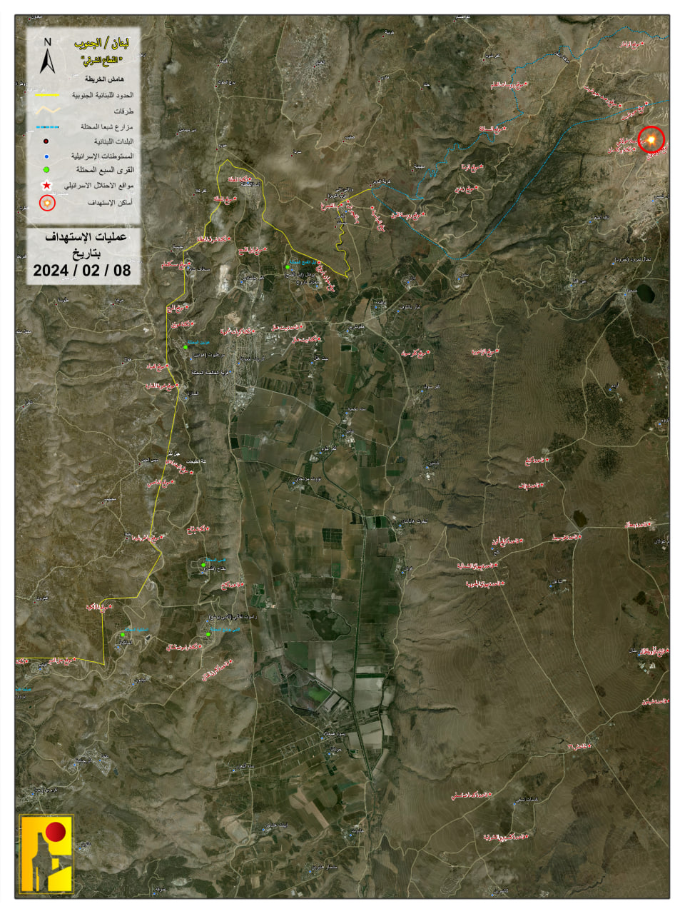 دعماً لشعبنا الفلسطيني الصامد في قطاع غزة وإسنادًا لمقاومته الباسلة والشريفة، استهدف مجاهدو المقاومة الإسلامية عند الساعة 12:20 من بعد ظهر يوم الخميس 08-02-2024 ثكنة "معاليه غولان" بصاروخي "فلق" وتم تحقيق إصابات مباشرة.