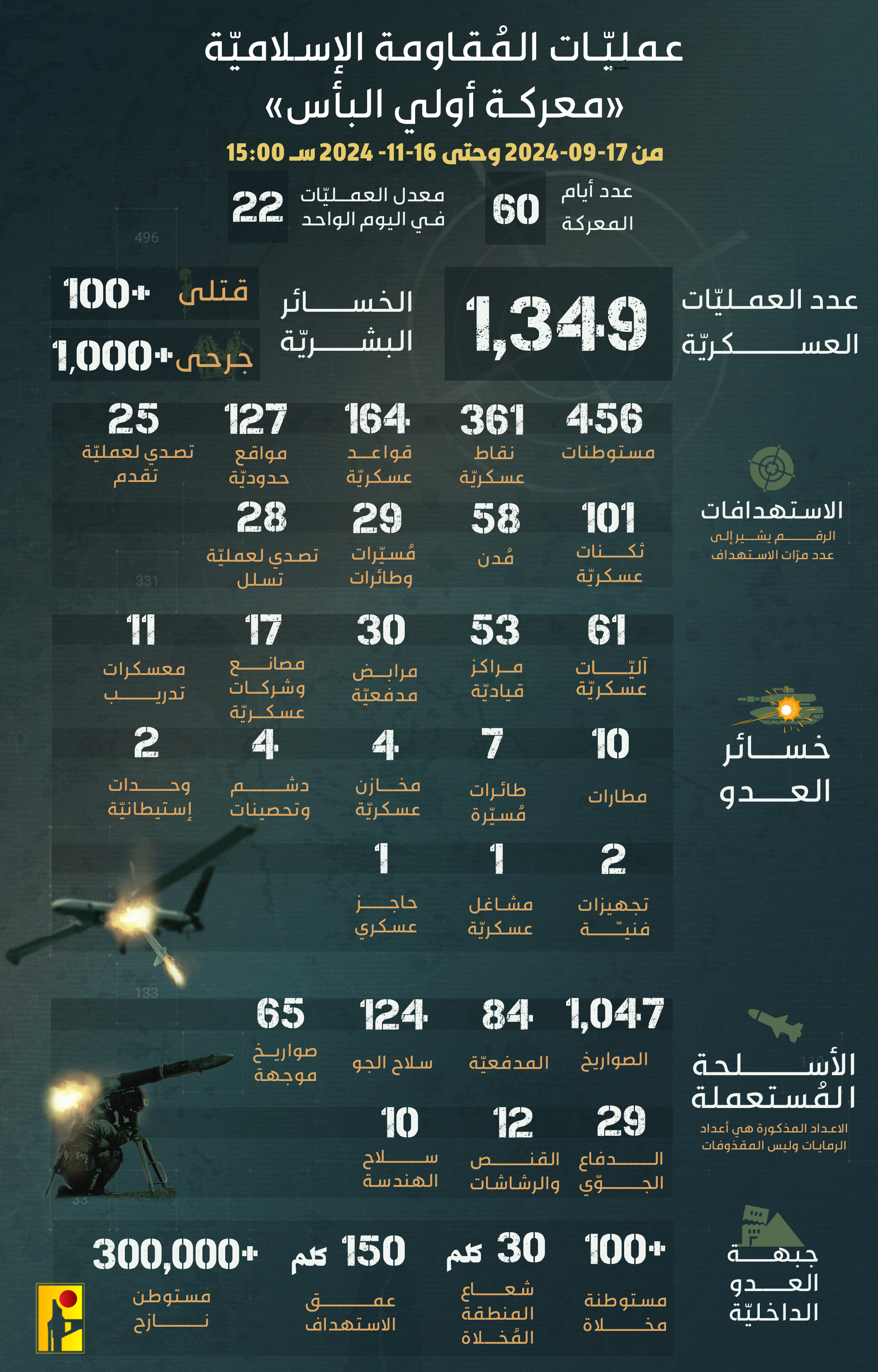 إنفوغراف | عمليات المقاومة الإسلامية في معركة أولي البأس | من تاريخ 2024/09/17 وحتى 2024/11/16 (الساعة 15:00)