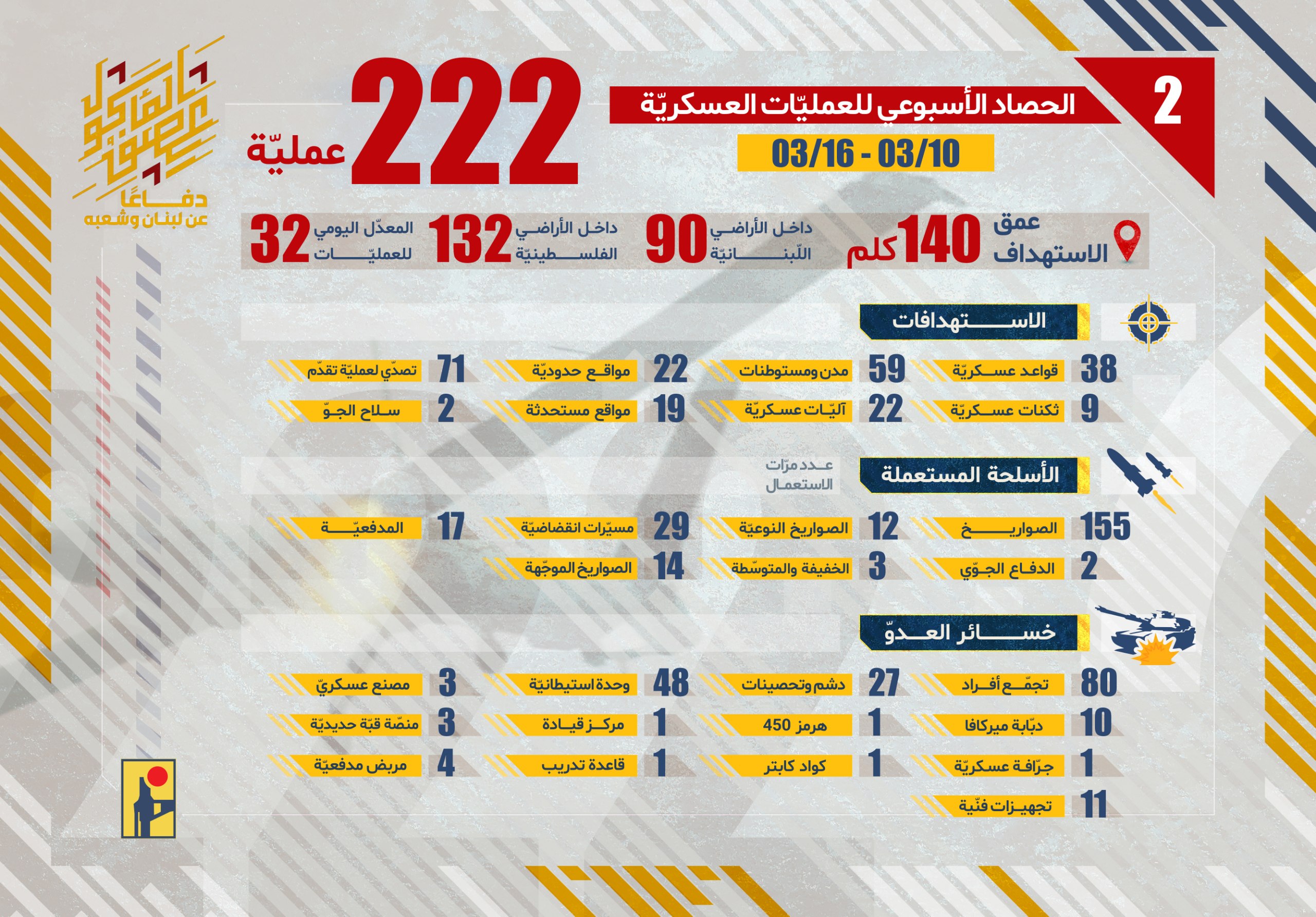 الحصاد الأسبوعي لعمليات المقاومة الإسلامية من تاريخ 10-03-2026 حتى 16-03-2026