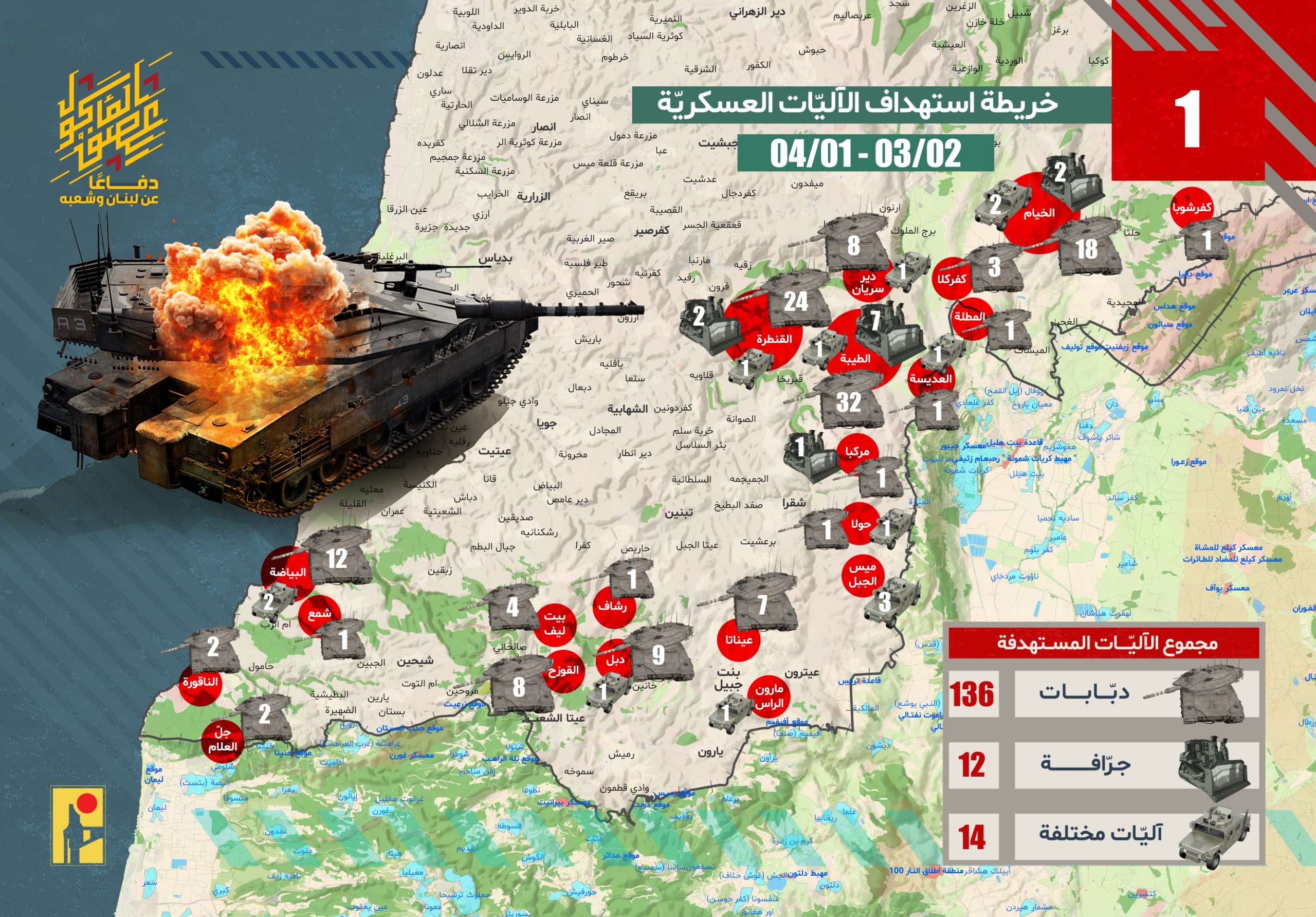 خريطة توضح عدد الآليات العسكرية التابعة لجيش العدو الإسرائيلي التي استهدفها مجاهدو المقاومة الإسلامية في مختلف ساحات المواجهة في جنوب لبنان خلال الشهر الأول من معركة العصف المأكول من تاريخ 02-03-2026 حتى 01-04-2026:
