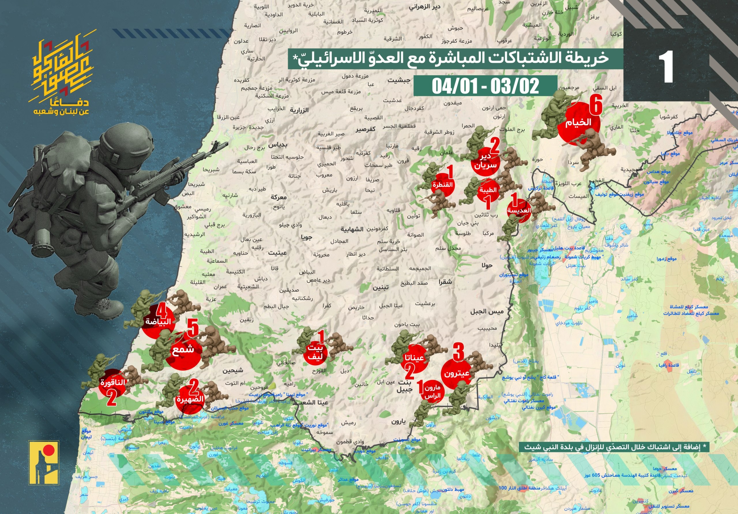 خريطة توضح الإشتباكات المباشرة التي خاضها مجاهدو المقاومة الإسلامية مع قوات جيش العدو الإسرائيلي في مختلف ساحات المواجهة في جنوب لبنان، بالإضافة إلى التصدّي لإنزالات العدو الإسرائيلي، خلال الشهر الأول من معركة العصف المأكول من تاريخ 02-03-2026 حتى 01-04-2026: