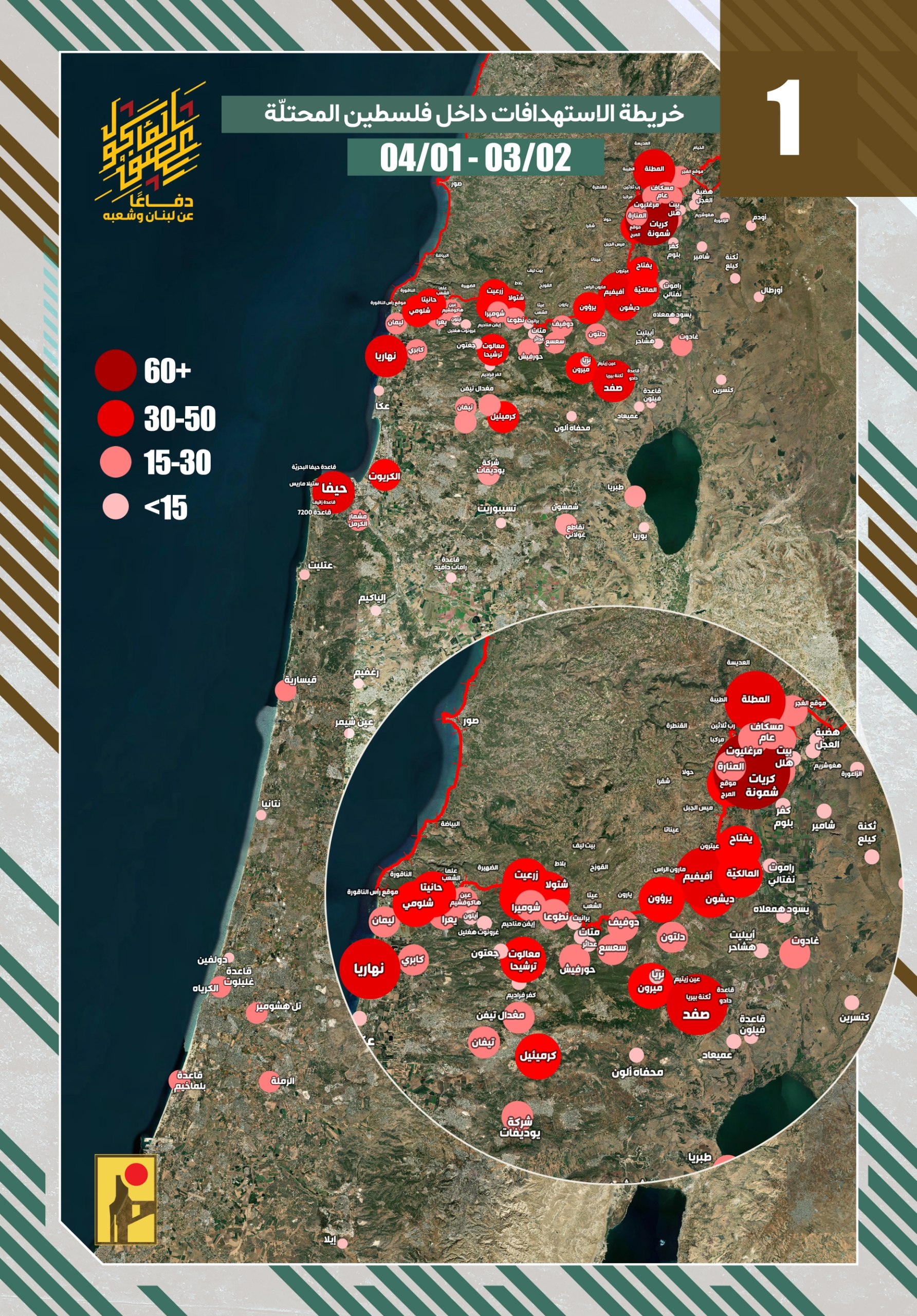 خريطة توضح الإستهدافات التي نفّذها مجاهدو المقاومة الإسلامية باتجاه الأراضي الفلسطينية المحتلة باستخدام الصواريخ والمسيّرات الانقضاضيّة خلال الشهر الأول من معركة العصف المأكول من تاريخ 02-03-2026 حتى 01-04-2026: