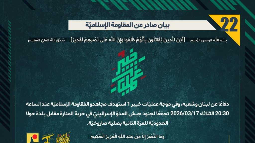 بيان صادر عن المقاومة الإسلامية (22): استهداف تجمع معادٍ في خربة المنارة مقابل بلدة حولا الحدوديّة للمرّة الثانية بصلية صاروخيّ ضمن موجة ’خيبر-1’