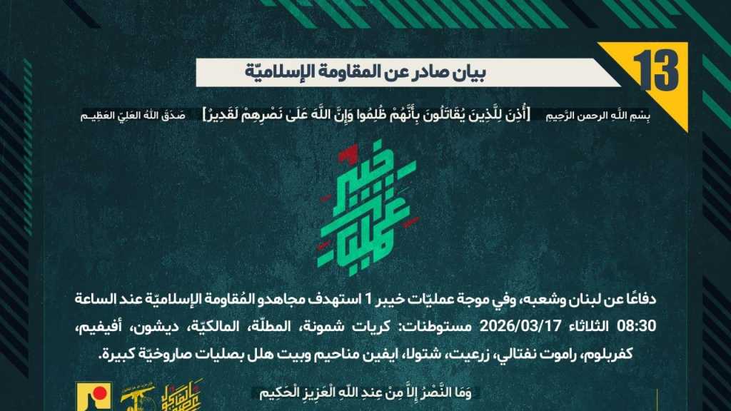 بيان صادر عن المقاومة الإسلامية (13): استهداف مستوطنات: كريات شمونة، المطلّة، المالكيّة، ديشون، أفيفيم، كفربلوم، راموت نفتالي، زرعيت، شتولا، ايفين مناحيم وبيت هلل بصليات صاروخيّة كبيرة ضمن موجة ’خيبر -1’
