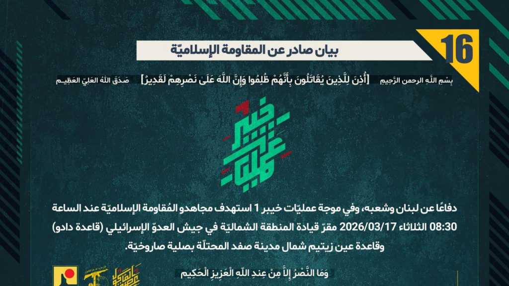 بيان صادر عن المقاومة الإسلامية (17): استهداف قاعدة عميعاد شمال بحيرة طبريا، وقاعدة شمشون غرب بحيرة طبريا بصليات صاروخيّة ضمن موجة ’خيبر-1’
