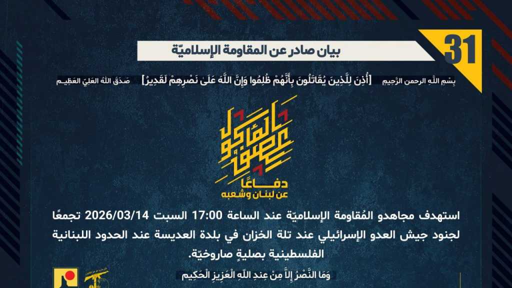 بيان صادر عن المقاومة الإسلامية (31): استهداف تجمع معادي عند تلة الخزان في بلدة العديسة عند الحدود اللبنانية الفلسطينية بصليةٍ صاروخيّة.