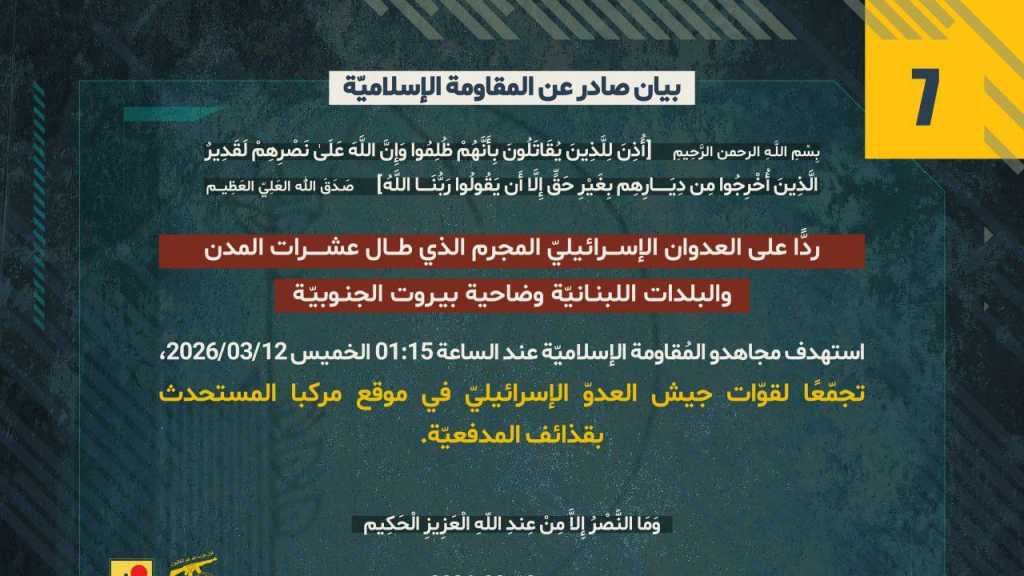 بيان صادر عن المقاومة الإسلامية (7): استهداف تجمع معادي في موقع مركبا المستحدث بقذائف المدفعية