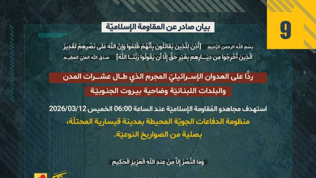 بيان صادر عن المقاومة الإسلامية (9): استهداف منظومة الدفاعات الجويّة المحيطة بمدينة قيسارية المحتلّة بصلية من الصواريخ النوعيّة.
