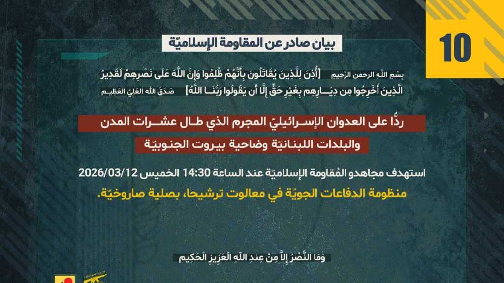 بيان صادر عن المقاومة الإسلامية (10):استهداف منظومة الدفاعات الجويّة في معالوت ترشيحا بصلية صاروخيّة.