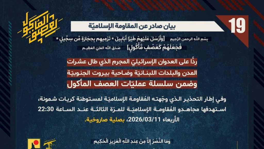 بيان صادر عن المقاومة الإسلامية (19): استهداف كريات شمونة بصلية صاروخية