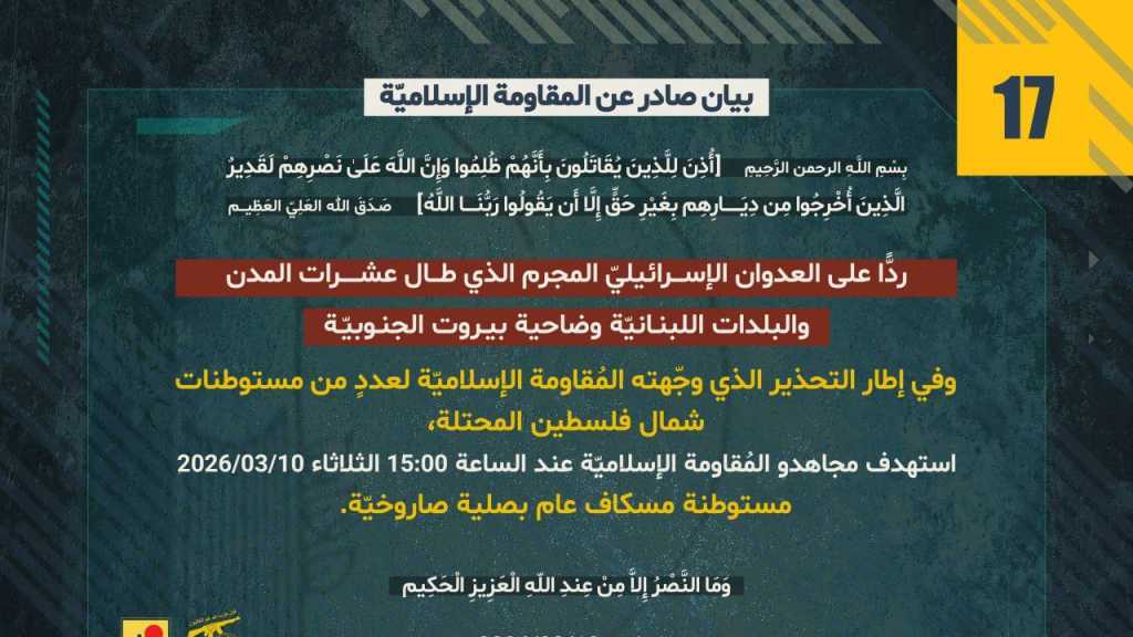 بيان صادر عن المقاومة الإسلامية (17): استهداف مستوطنة مسكاف عام بصلية صاروخيّة.