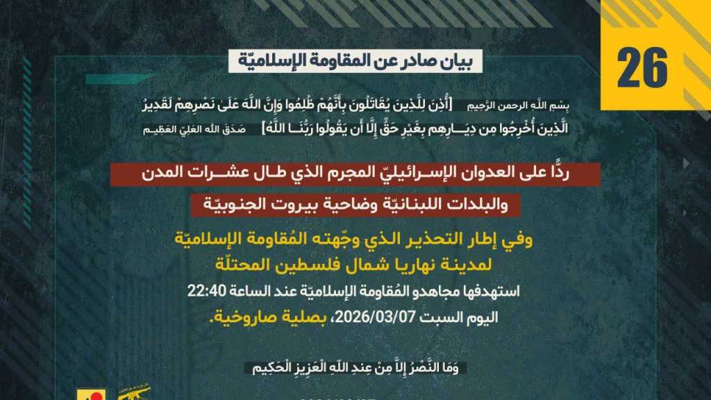 بيان صادر عن المقاومة الإسلامية (26): استهداف مدينة نهاريا بصلية صاروخية
