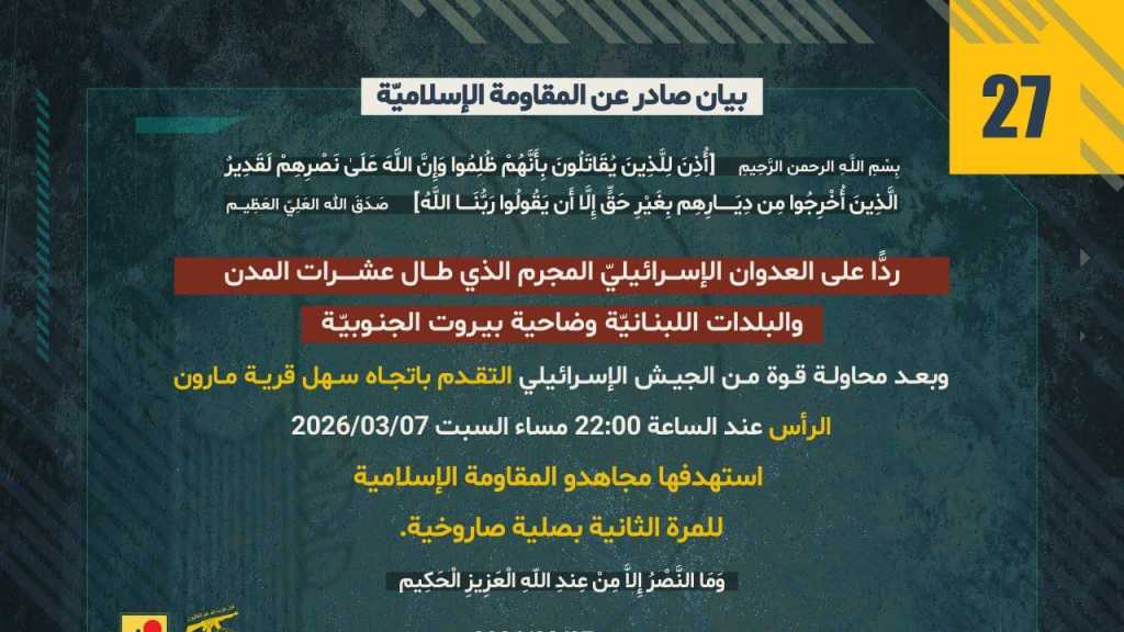 بيان صادر عن المقاومة الإسلامية (27): التصدي لمحاولة تقدم ثانية في مارون الراس