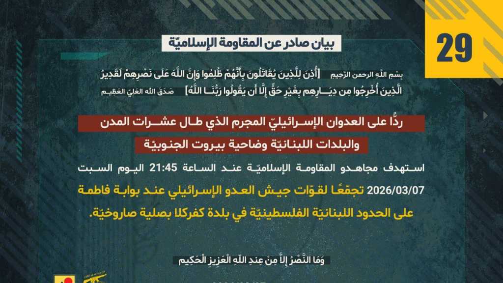 بيان صادر عن المقاومة الإسلامية (29): استهداف تجمع للعدوّ الإسرائيليّ عند بوابة فاطمة على الحدود اللبنانيّة الفلسطينيّة في بلدة كفركلا بصليةٍ صاروخيّة.