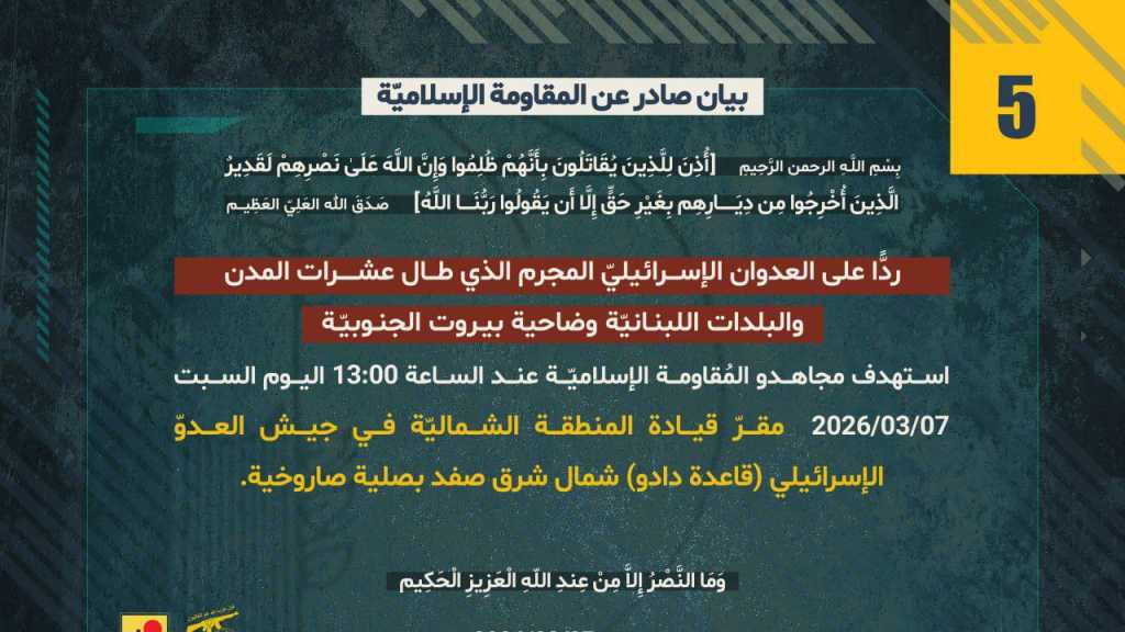 بيان صادر عن المقاومة الإسلامية (5): استهداف مقرّ قيادة المنطقة الشماليّة في جيش العدوّ الإسرائيلي بصلية صاروخية