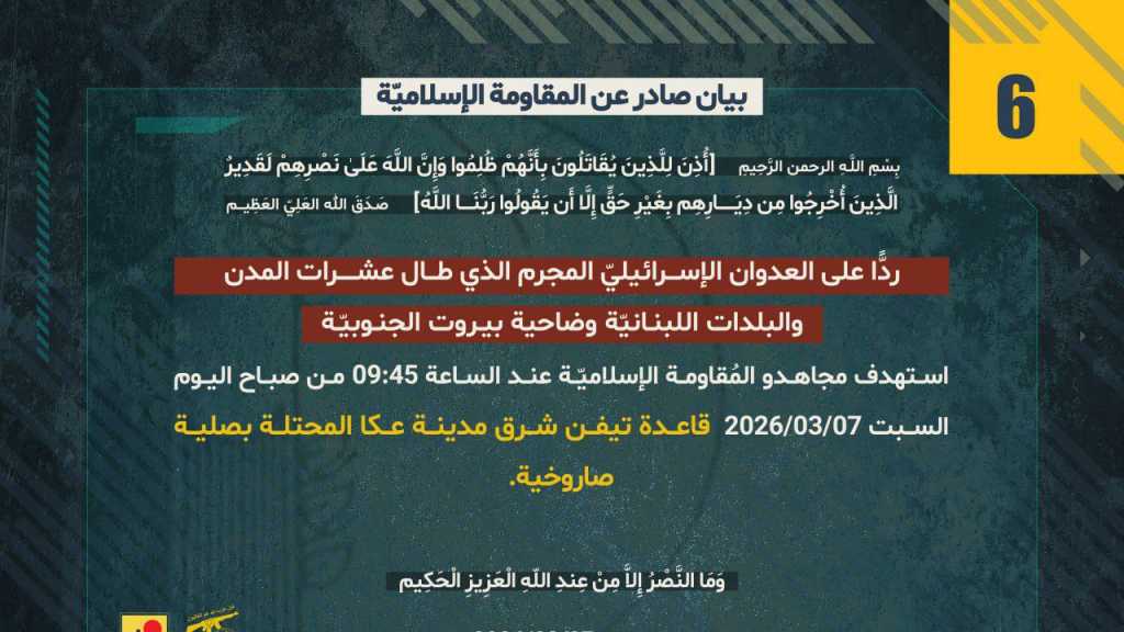 بيان صادر عن المقاومة الإسلامية (6): استهداف قاعدة تيفن شرق مدينة عكا المحتلة بصلية صاروخية.