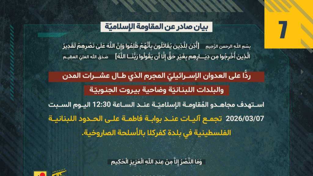 بيان صادر عن المقاومة الإسلامية (7): استهداف تجمع آليات عند بوابة فاطمة على الحدود اللبنانية الفلسطينية في بلدة كفركلا بالأسلحة الصاروخية.
