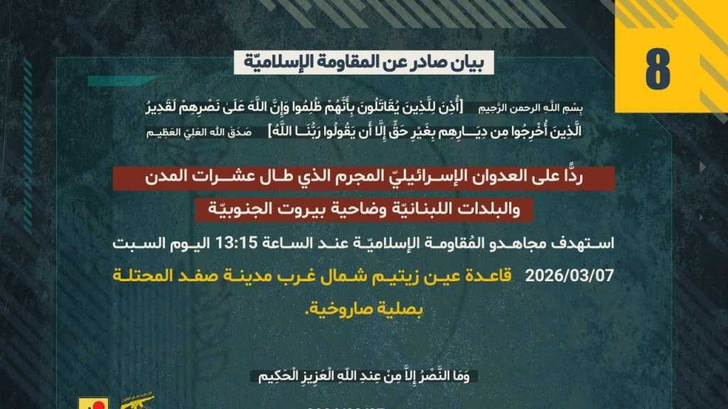 بيان صادر عن المقاومة الإسلامية (8): استهداف قاعدة عين زيتيم شمال غرب مدينة صفد المحتلة بصلية صاروخية.