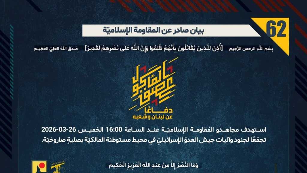 بيان صادر عن المقاومة الإسلامية (62): استهداف تجمع لجنود وآليات جيش العدوّ الإسرائيليّ في محيط مستوطنة المالكيّة بصليةٍ صاروخيّة.
