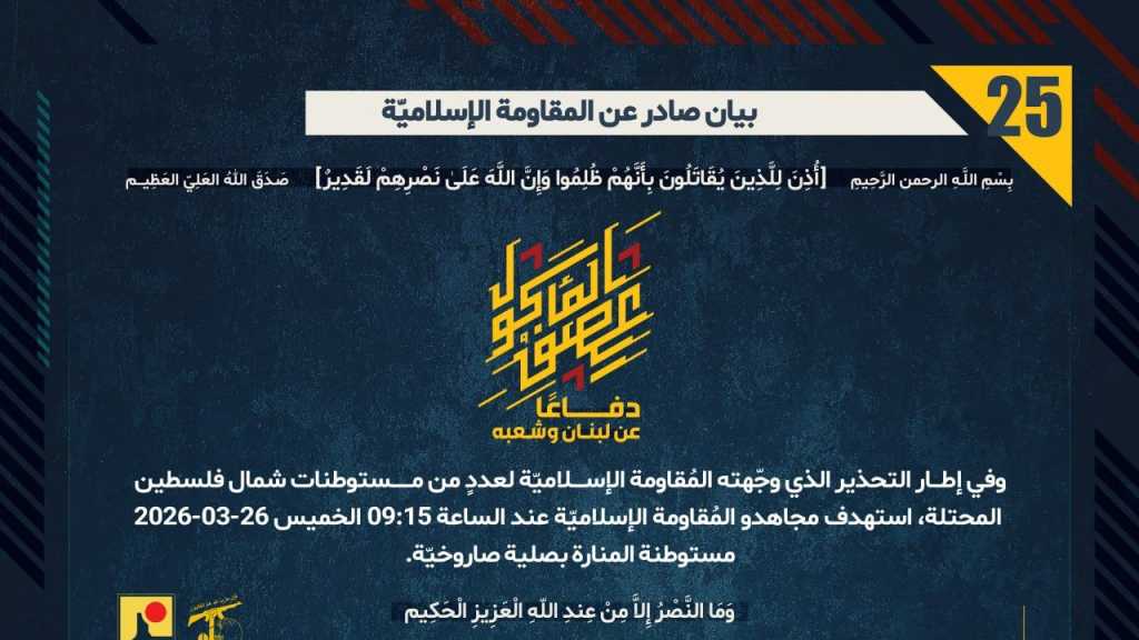 بيان صادر عن المقاومة الإسلامية (25): استهداف مستوطنة المنارة بصلية صاروخيّة.