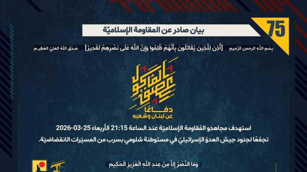 بيان صادر عن المقاومة الإسلامية (75):‏ استهداف تجمع لجنود جيش العدوّ الإسرائيليّ في مستوطنة شلومي بسرب من المسيّرات الانقضاضيّة.