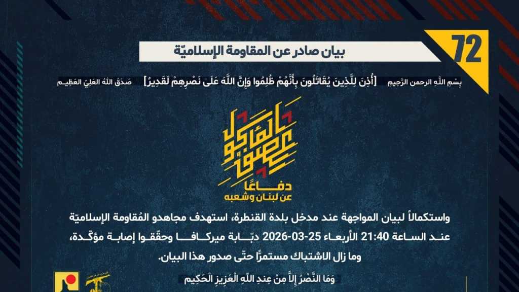 بيان صادر عن المقاومة الإسلامية (72): استهداف دبّابة ميركافا عند مدخل بلدة القنطرة