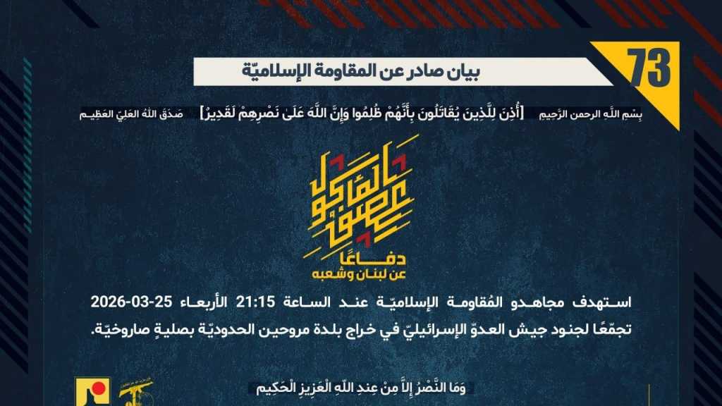 بيان صادر عن المقاومة الإسلامية (73): استهداف تجمع لجنود جيش العدوّ الإسرائيليّ في خراج بلدة مروحين الحدوديّة بصليةٍ صاروخيّة.