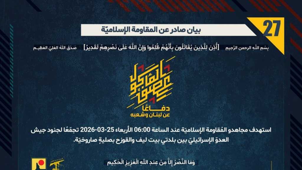 بيان صادر عن المقاومة الإسلامية (27): استهداف تجمع لجنود جيش العدوّ الإسرائيليّ بين بلدتي بيت ليف والقوزح بصليةٍ صاروخيّة.
