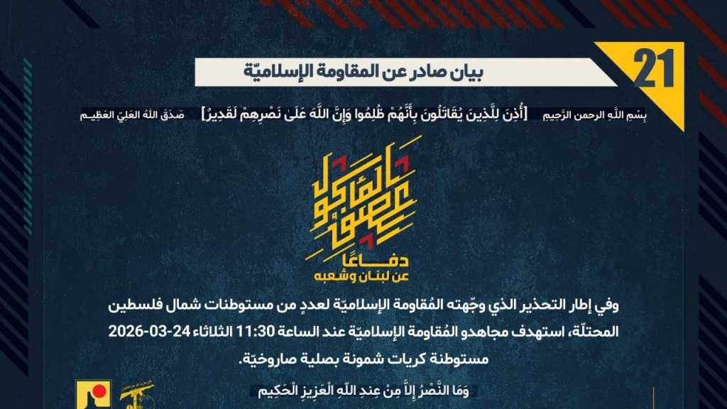 بيان صادر عن المقاومة الإسلامية (21): استهداف مستوطنة كريات شمونة بصلية صاروخيّة.