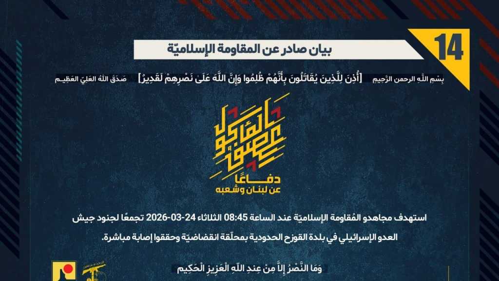 بيان صادر عن المقاومة الإسلامية (14): استهداف تجمع لجنود جيش العدو الإسرائيلي في بلدة القوزح الحدودية بمحلّقة انقضاضيّة