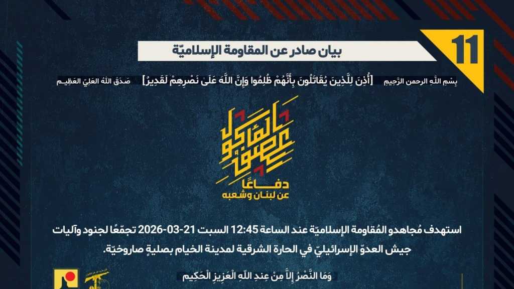بيان صادر عن المقاومة الإسلامية (11):استهداف تجمّع لجنود وآليات جيش العدوّ الإسرائيليّ في الحارة الشرقية لمدينة الخيام بصليةٍ صاروخيّة