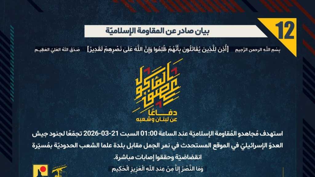 بيان صادر عن المقاومة الإسلامية (12): استهداف تجمّع لجنود جيش العدوّ الإسرائيليّ في الموقع المستحدث في نمر الجمل مقابل بلدة علما الشعب الحدوديّة بمُسيّرة انقضاضيّة وحققوا إصابات مباشرة.