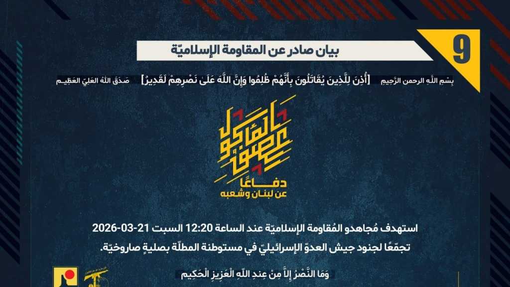 بيان صادر عن المقاومة الإسلامية (9): استهداف تجمّع لجنود جيش العدوّ الإسرائيليّ في مستوطنة المطلّة بصليةٍ صاروخيّة