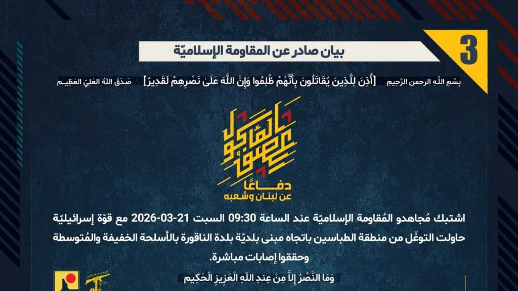 بيان صادر عن المقاومة الإسلامية (7): يخوض مُجاهدو المُقاومة الإسلاميّة منذ الساعة 10:00 السبت 21-03-2026 اشتباكات مباشرة مع قوّات جيش العدوّ الإسرائيليّ في مدينة الخيام بالأسلحة الخفيفة والمتوسّطة والقذائف الصاروخيّة