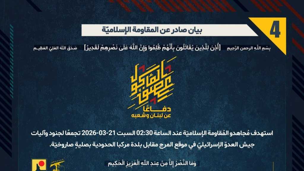 بيان صادر عن المقاومة الإسلامية (4): استهداف تجمع لجنود وآليات جيش العدوّ الإسرائيليّ في موقع المرج مقابل بلدة مركبا الحدودية بصليةٍ صاروخيّة.