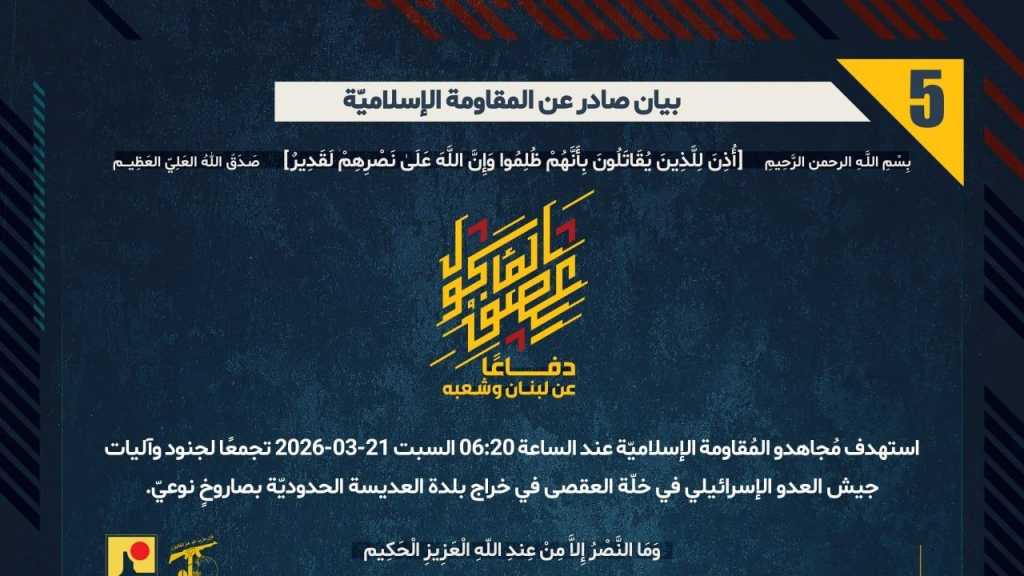 بيان صادر عن المقاومة الإسلامية (5): استهداف تجمع لجنود وآليات جيش العدو الإسرائيلي في خلّة العقصى في خراج بلدة العديسة الحدوديّة بصاروخٍ نوعيّ.
