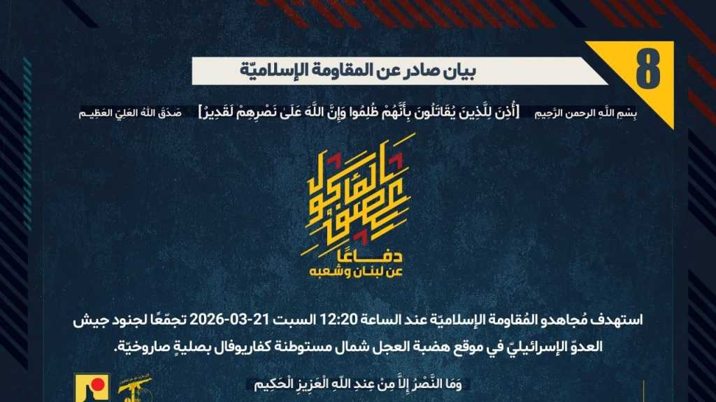 بيان صادر عن المقاومة الإسلامية (8): استهداف تجمّع لجنود جيش العدوّ الإسرائيليّ في موقع هضبة العجل شمال مستوطنة كفاريوفال بصليةٍ صاروخيّة