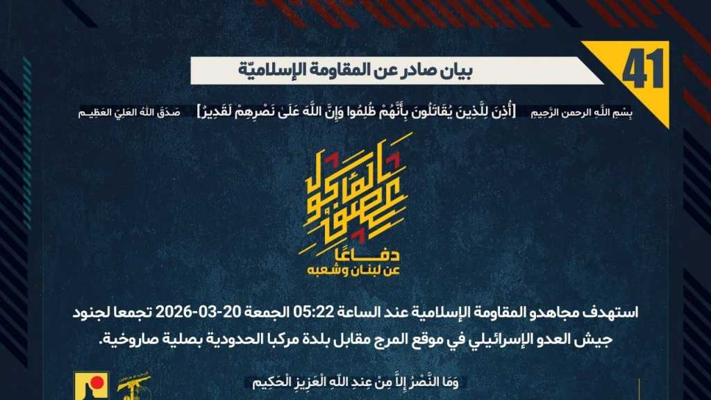بيان صادر عن المقاومة الإسلامية (41): استهداف تجمع لجنود جيش العدو الإسرائيلي في موقع المرج مقابل بلدة مركبا الحدودية بصلية صاروخية.
