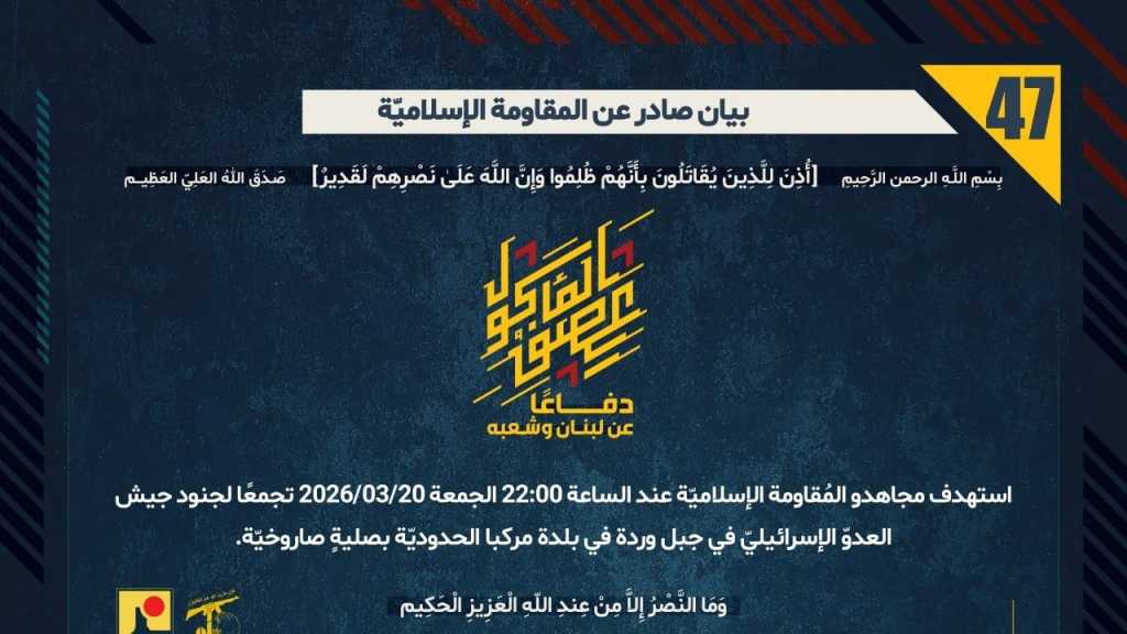 بيان صادر عن المقاومة الإسلامية (47): استهداف تجمع لجنود جيش العدوّ الإسرائيليّ في جبل وردة في بلدة مركبا الحدوديّة بصليةٍ صاروخيّة.