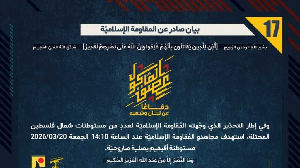 بيان صادر عن المقاومة الإسلامية (17): استهداف مستوطنة أفيفيم بصلية صاروخيّة.