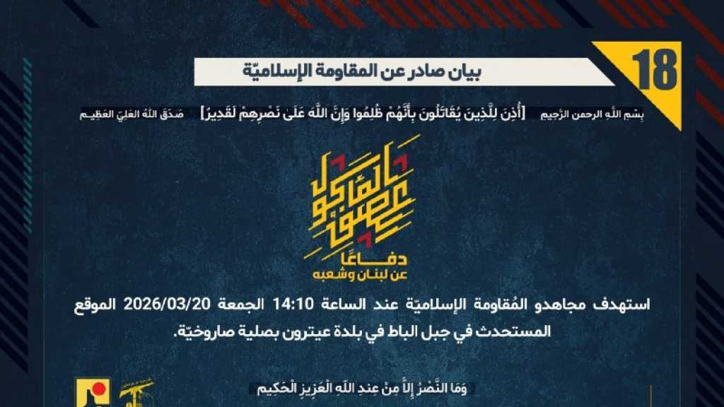 بيان صادر عن المقاومة الإسلامية (18): استهداف الموقع المستحدث في جبل الباط في بلدة عيترون بصلية صاروخيّة.