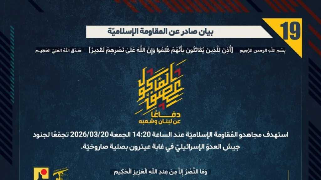 بيان صادر عن المقاومة الإسلامية (19): استهداف تجمع لجنود العدوّ الإسرائيليّ في غابة عيترون بصلية صاروخيّة.
