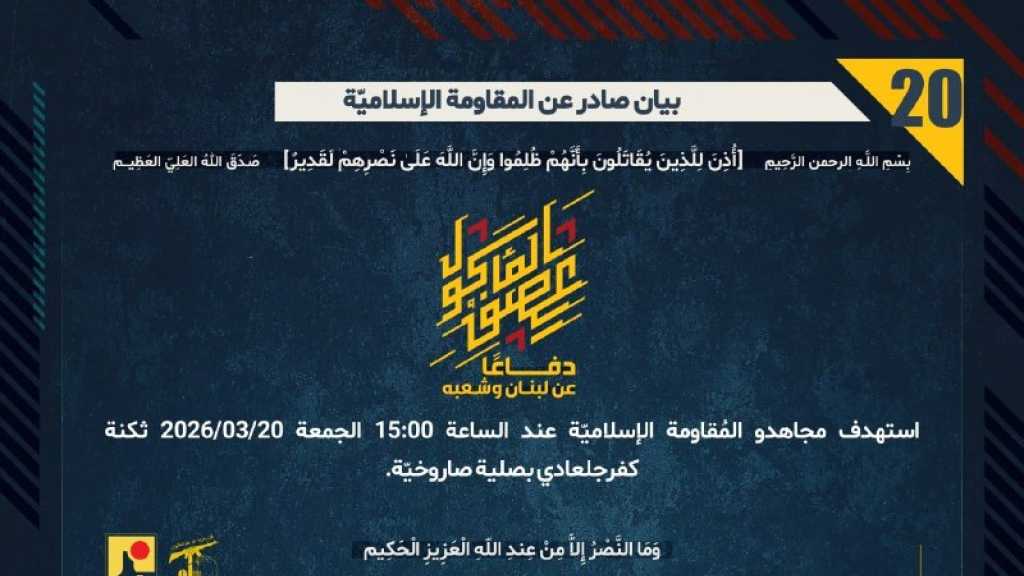 بيان صادر عن المقاومة الإسلامية (20): استهداف ثكنة كفرجلعادي بصلية صاروخيّة.