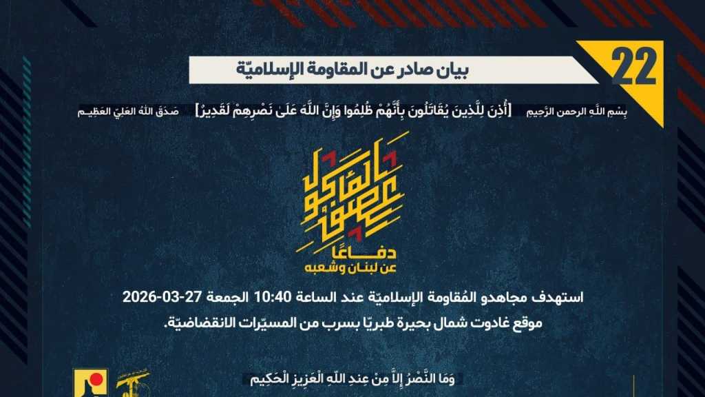 بيان صادر عن المقاومة الإسلامية (22): استهداف موقع غادوت شمال بحيرة طبريّا بسرب من المسيّرات الانقضاضيّة.