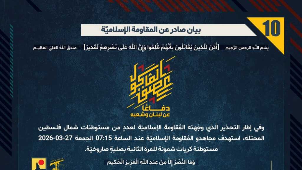 بيان صادر عن المقاومة الإسلامية (10): استهداف مستوطنة كريات شمونة للمرة الثانية بصليةٍ صاروخيّة.